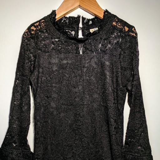 Beautiful Lace top that is lined in black for a soft smooth fit and feel. Flared long sleeve and a soft ruffled collar with a button on the back at the neck.