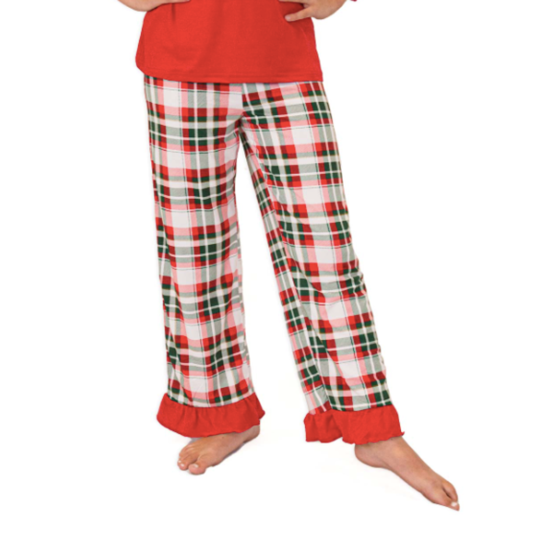 These Christmas sleep pants will be the hit of Christmas morning.  The entire family will look the part in this this plaid pattern. Polyester & Spandex. Machine Wash Gentle Cycle, Tumble Dry Low, Do Not Iron.